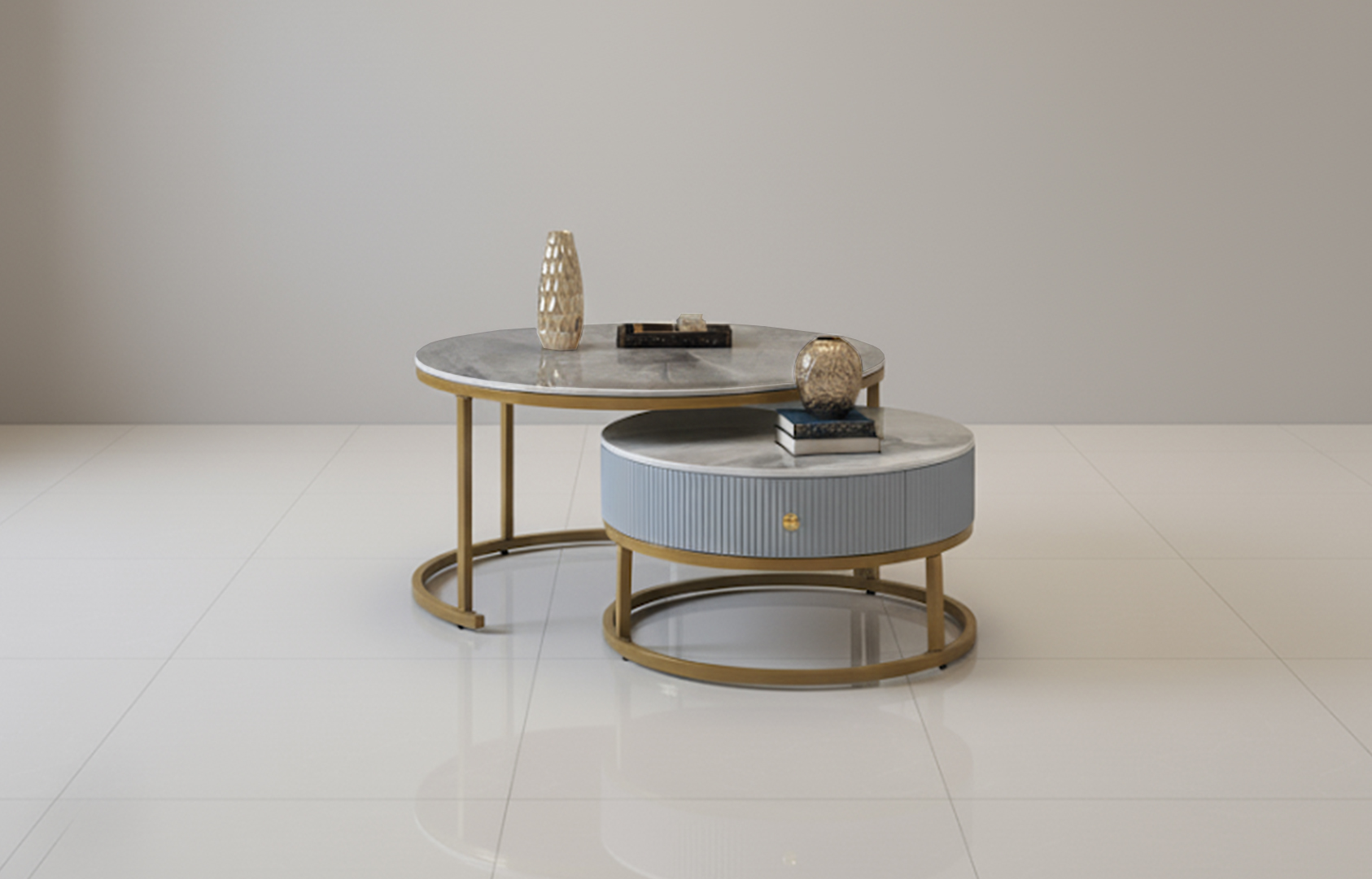 Elevate your living space with this exquisitely designed two-piece nesting coffee table set. Each table showcases a stunning sintered stone top in a rich grey marble pattern, offering durability and a luxurious aesthetic that’s easy to maintain. The robust powder-coated Gold metal bases provide a strong foundation and a modern industrial touch. A highlight is the smaller table’s integrated pull-out drawer, featuring an elegant ribbed texture and a distinctive gold-accented pull, perfect for discreet storage. This versatile set seamlessly combines refined style with smart utility.