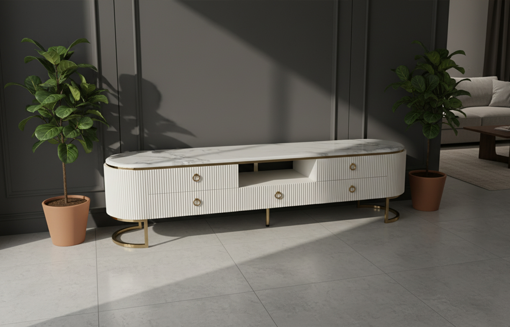 • Tabletop: Features a continuous, white marble top with delicate gray veining. This elegant surface provides a durable platform for a large television and reinforces the luxury feel.