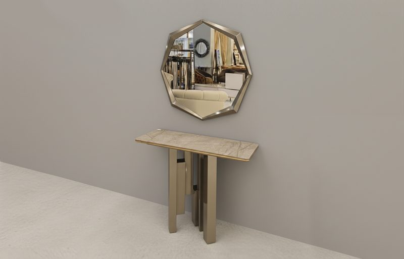 • Design: The accompanying wall mirror features a dramatic, multi-faceted geometric frame (octagonal or similar polygon) with deeply beveled edges. This creates a captivating, sculptural effect that maximizes light and visual depth.