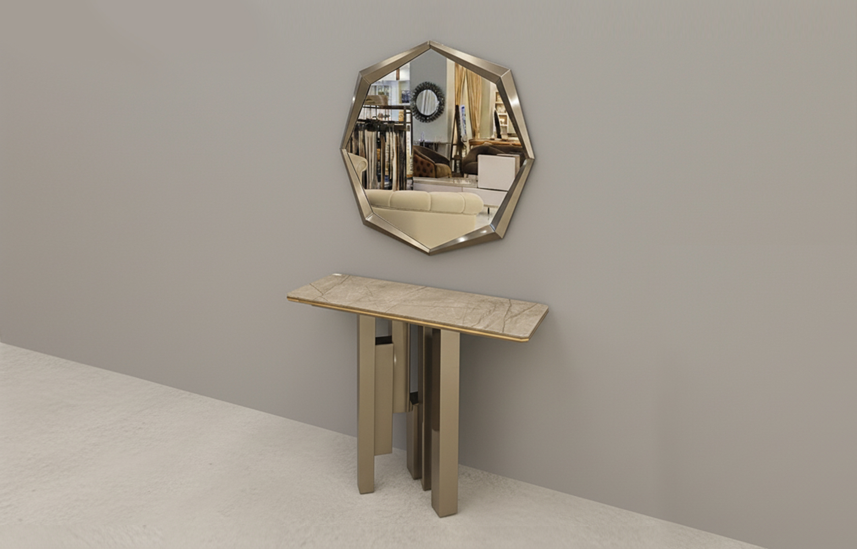 • Impact: The mirror’s shape and reflective quality balance the linear table, adding glamour and dimension to the overall ensemble.