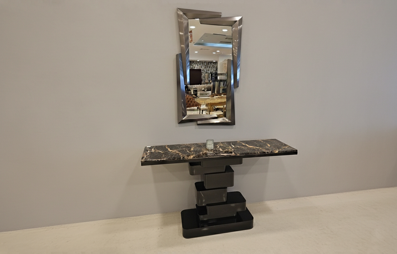 - Asymmetrical Modern Mirror: Complementing the console is an eye-catching mirror with an artfully fragmented, asymmetrical frame in a dark metallic finish. This abstract design adds a touch of avant-garde style, enhancing the visual intrigue of your space.
