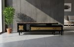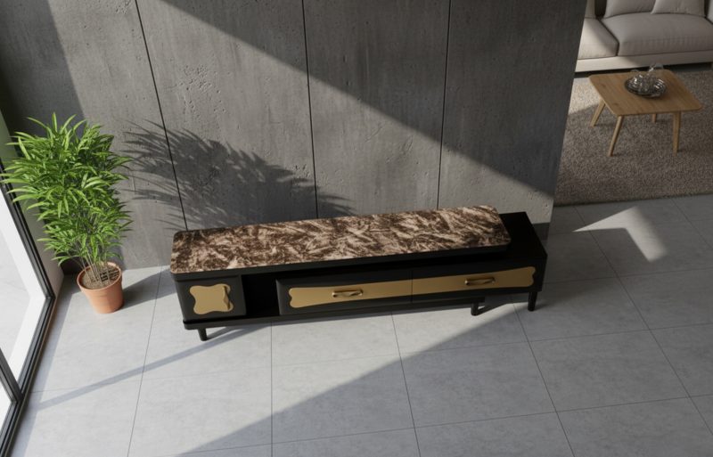 This elegant TV unit combines dark, rich finishes with ornate metallic accents and a striking marble top, delivering a sophisticated blend of Art Deco glamour and modern functionality for any living or media room.